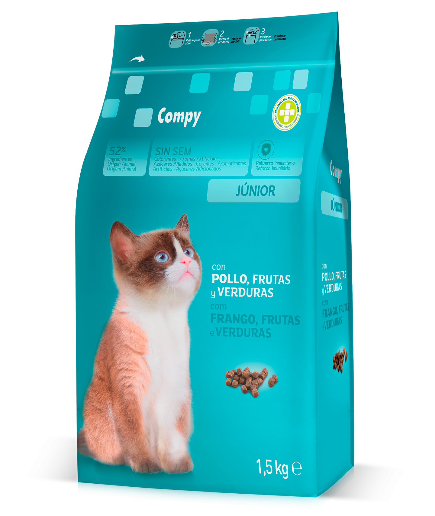 Compy Gatitos Júnior con Pollo, Frutas y Verduras. Alimento completo para gatitos desde los 2 meses hasta el año de edad y para gatas en gestación y lactación.